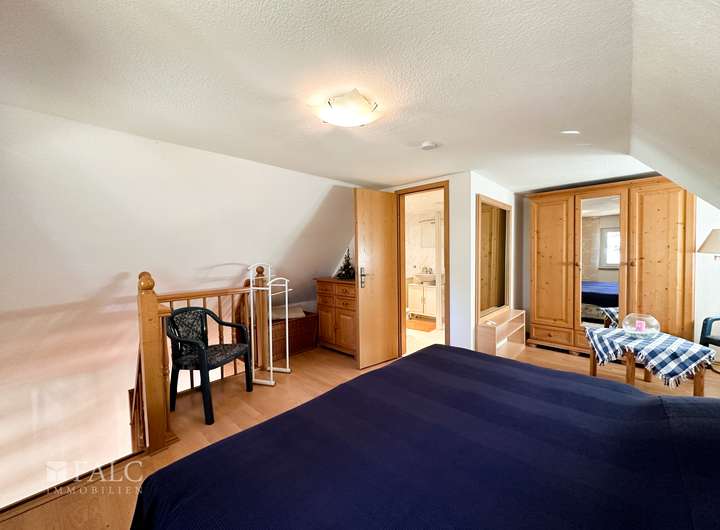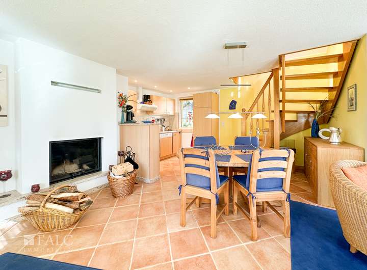 Die Hauptwohnung, wurde 2012 erweitert, und verfügt heute im Erdgeschoß über eine großzügigen, offen gestalteten Wohnbereich mit Kamin, einer Einbauküche und dem Zugang zur Terrasse, über deine Treppe erreicht man das Obergeschoß, in dem der Schlafraum, mit einem Bad en suite und Zugang zu einem nach Süden ausgerichteten Balkon, ist.
