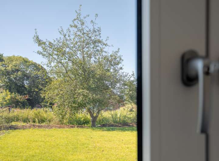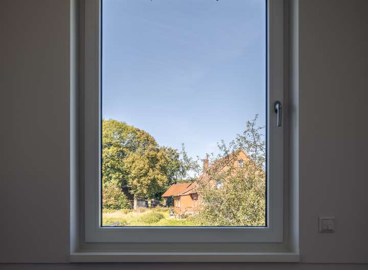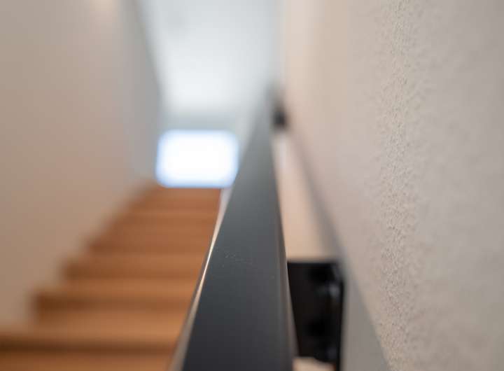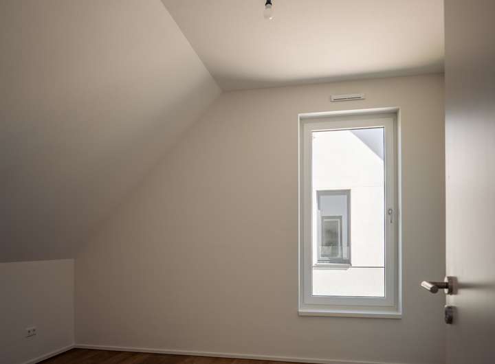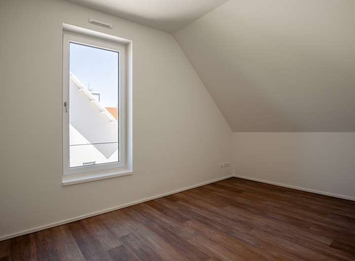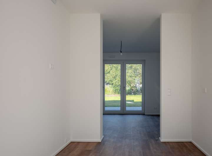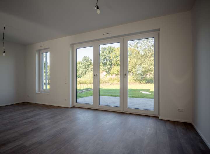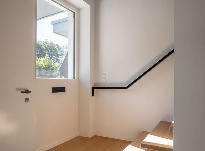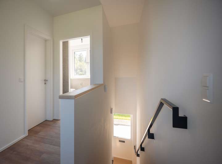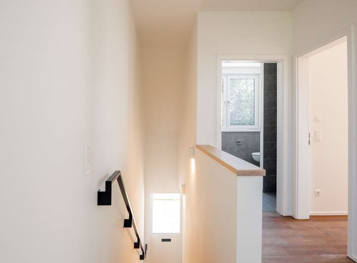 Im EG befindet sich das sehr helle Wohnzimmer, verbunden mit einer Schiebetür zur angrenzenden, großzügigen und hellen Küche. Das sehr großzügige Wohnzimmer, mit einem herrlichen Blick in ihren neuen Garten bietet Ihnen viele Gestaltungsmöglichkeiten. Das Gäste WC und der geräumige Flur runden das gelungene EG ab. Über eine sehr schöne Treppe mit Naturholzbelag gelangen Sie über den geräumigen Flur in das OG mit seinen 2 Schlafräumen. Im oberen Flur bietet sich die Möglichkeit eines Arbeitsplatzes. Die Räume im OG verfügen durch die großzügigen Fenster über sehr viel Tageslicht, lassen sich aber auch bequem, durch die elektrischen Jalousien abdunkeln. Sämtliche Fenster im Haus bestehen aus einer 3 fach Verglasung mit elektrisch betriebenen Jalousien und bieten somit absoluten Schall und Wärmeschutz. Ein absolutes Highlight bildet ihr neuer privater Garten mit großer Terrasse. Hier genießen Sie und Ihre Lieben die freie Natur. Entspannen Sie auf Ihrer Terrasse und beenden Sie Ihren Alltag in absoluter Ruhe.