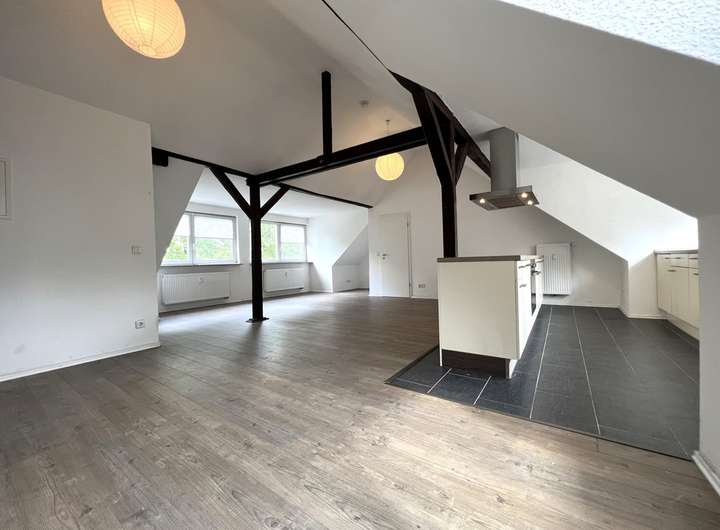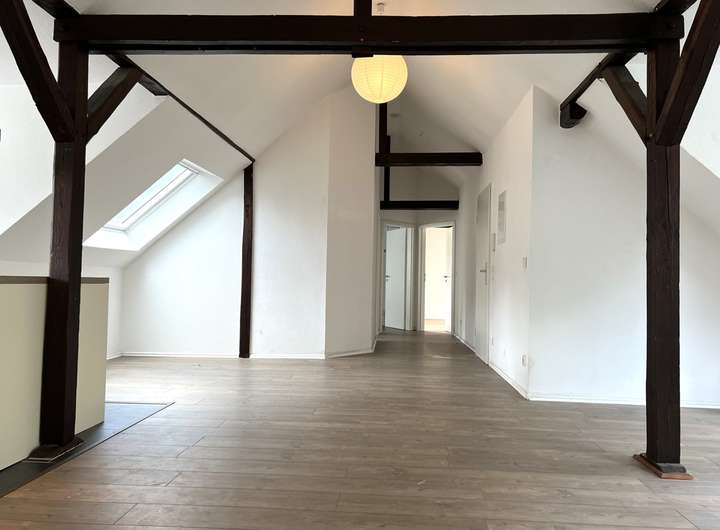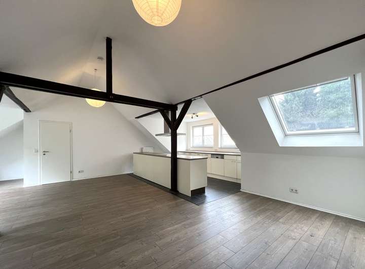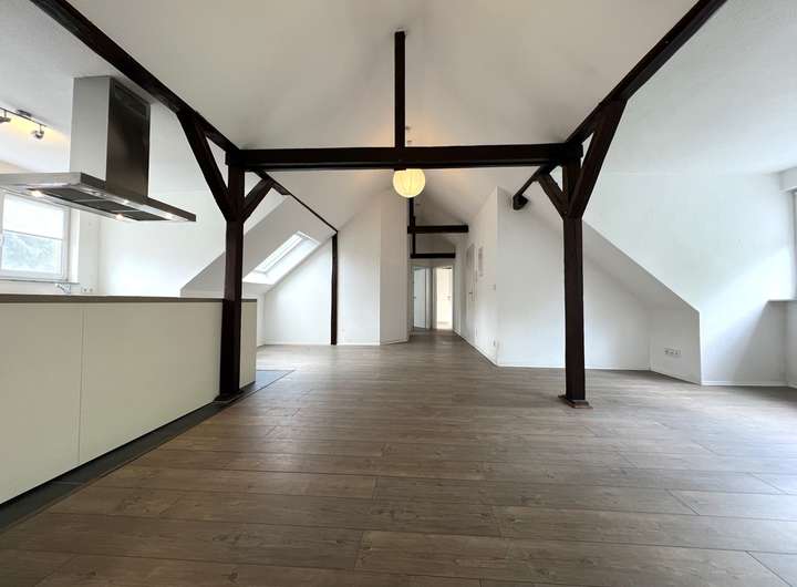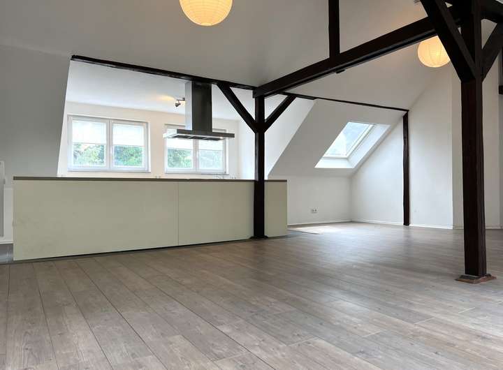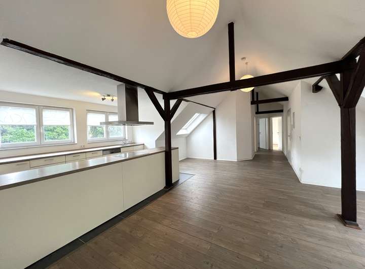 Bei dieser Wohnung handelt es sich um eine traumhaft schöne, lichtdurchflutete Wohnung mit offenen Balken in der vierten Etage eines gepflegten Mehrfamilienhauses. Die 103 m² verteilen sich auf insgesamt 3 Räume. Highlight ist sicherlich der sehr großzügige Wohn- und Essbereich. Eine breite Fensterfront sorgt für viel Licht. Der Küchenbereich bietet Ihnen die Möglichkeit eine Kochinsel zu installieren. Das Master-Badezimmer ist mit einer Badewanne und Dusche ausgestattet und bietet außerdem einen Waschmaschinenanschluss. Ein weiteres Gäste-WC finden Sie separat neben dem Wohnbereich. Zwei weitere Zimmer runden das Angebot dieser Wohnung ab.