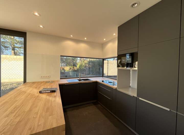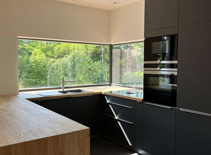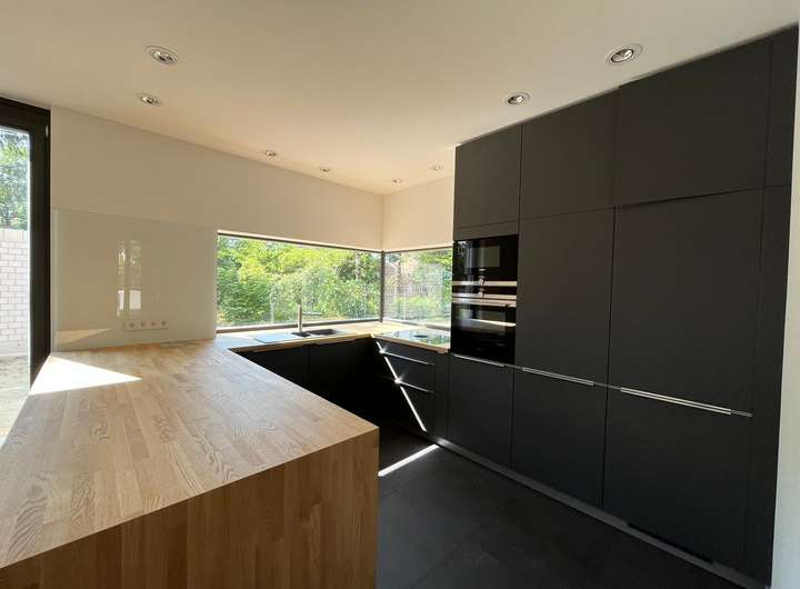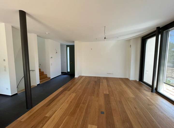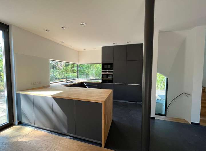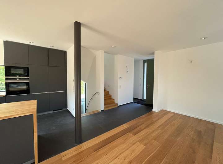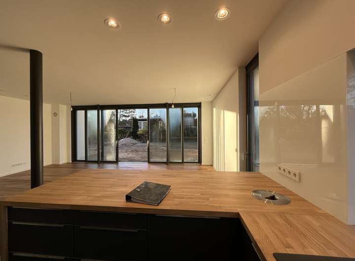 Im Erdgeschoß befindet sich eine einladende Wohn-Ess-Küche mit einer hochwertigen Markenküche und Markeneinbaugeräten (u.a. Bora-Abluftsystem), von wo aus man seine Familie oder Gäste mit Köstlichkeiten verwöhnen kann.