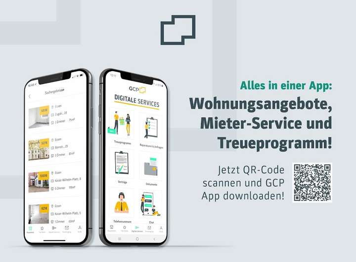 Liebe Mietinteressent:innen, bei uns in guten Wänden – auch digital: In vielen Anzeigen finden Sie einen Video-Rundgang oder 360°-Rundgang. So können Sie einen guten ersten Eindruck der Wohnung oder Gewerbeeinheit bekommen. Sie haben eine lange Anfahrt zum Wunschobjekt? Dann führen unsere Mitarbeiter:innen auf Anfrage auch gerne eine Vorab-Online-Besichtigung per Handy oder Tablet mit Ihnen durch. Im nächsten Schritt erfolgt die persönliche Besichtigung vor Ort. Profitieren Sie auch von unserem Angebot zur digitalen Mietvertragsunterzeichnung – schnell und sicher online! Auch nach dem Einzug bietet die GCP Service-App digitale Unterstützung bei Ihren Anliegen.