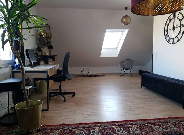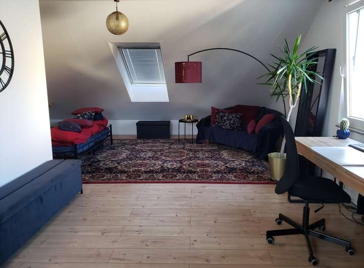 Helles Dachstudio über die gesamte Grundfläche , was sich auch in 2 Bereiche (Arbeitszimmer & Gästezimmer ) aufteilen läßt.