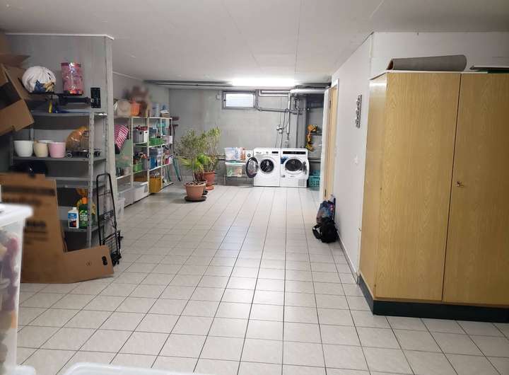 mit Anschlüssen für Waschmaschine , Trockner, viel Abstellfläche und Platz für Fitness o.ä.