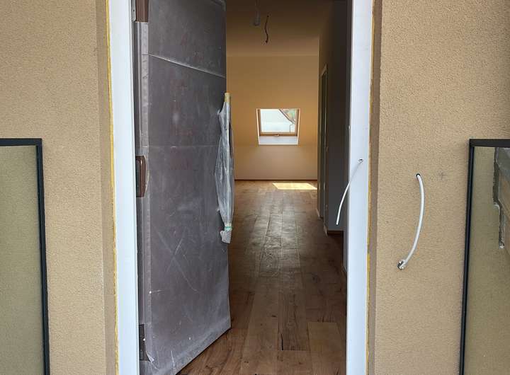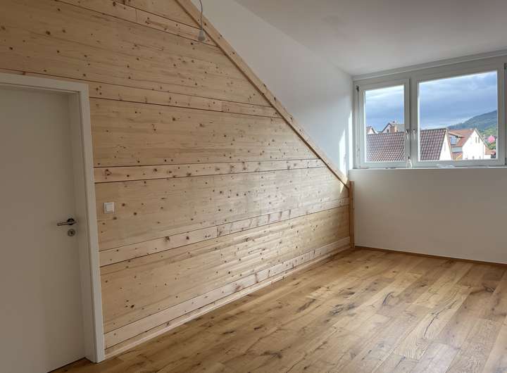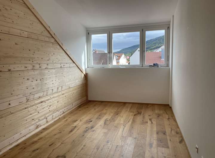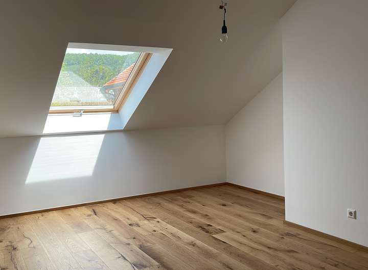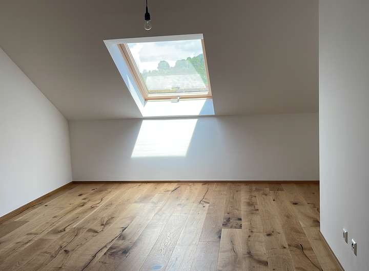 Die großen Dachfenster durchfluten den Wohnbereich mit viel Licht und somit ist es sehr hell. Vom Wohnzimmer aus gelangt man dann ins Schlafzimmer.