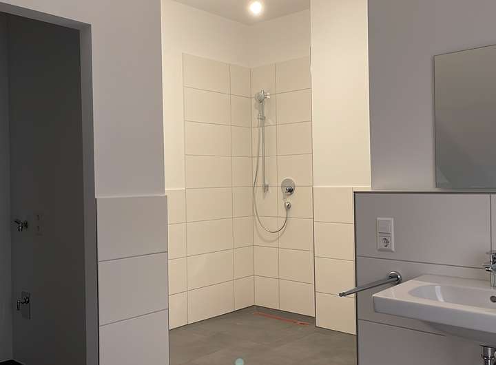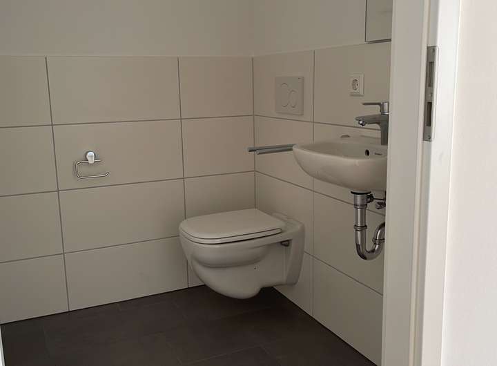 Sie können diese ansprechende DG-Wohnung beziehen, die durch eine gehobene Innenausstattung besticht. Zu dem Apartment zählen neben drei hübschen Zimmern nicht nur ein Badezimmer, sondern auch ein separates Gäste-WC. Die Wohnung ist barrierefrei und lässt sich bequem über einen Fahrstuhl erreichen. Sie betreten die Wohnung über eine Diele, von wo sie in das Kinder-/Arbeitszimmer, Gäste-WC und auch in das barrierefreie Bad mit begehbarer Dusche gelangen. In dem Abstellraum welches man vom Bad aus erreicht hat man die Möglichkeit eine Waschmaschine und ein Trockner anzuschließen. Am Ende der Diele gelangt man in den offenen und großzügigen Wohn-/Ess-u. Küchenbereich mit Einbauküche.