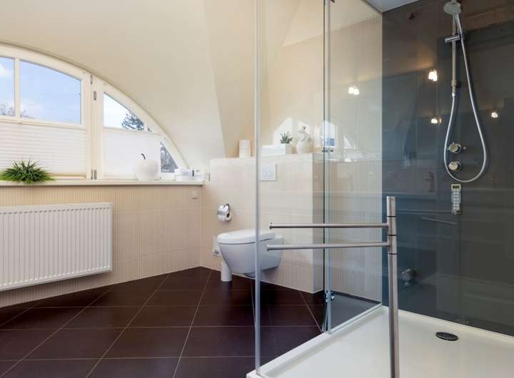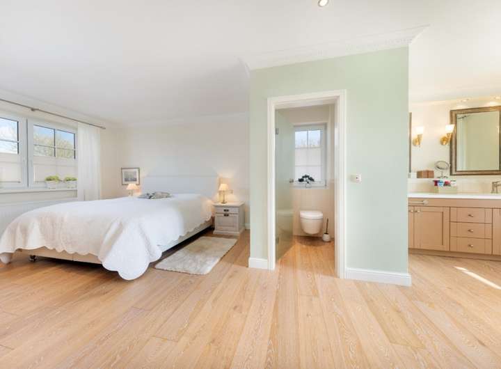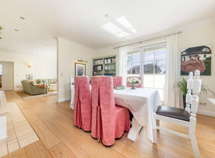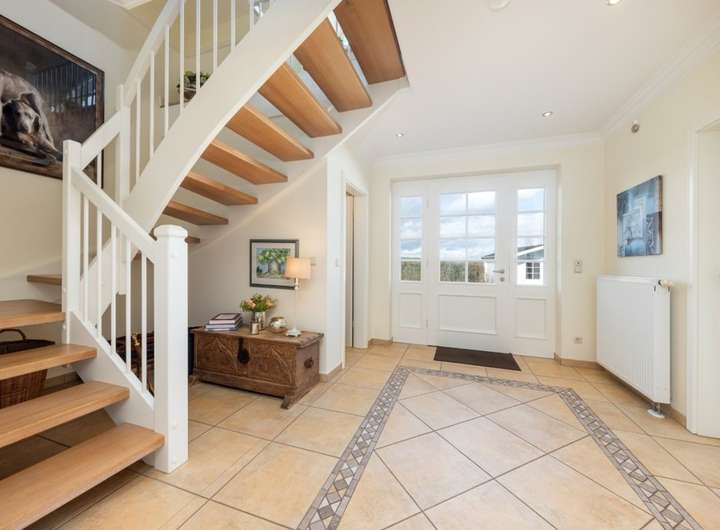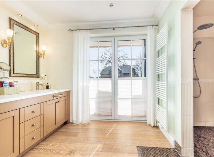 Hochwertige Landhausdielen im EG, große Vollholzinnentüren, repräsentative Holztreppe ,klassische Heizkörper, moderne Bäder mit Fußbodenheizung und großen Duschen, Gas-Heizung, Vorbereitung für Ladung E- Auto