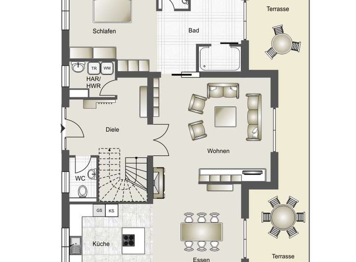 EG mit großem Wohn-Essbereich und mod. geschlossenem Kamin, große elektrische Markise, Schlaftrakt mit eigenem großen Bad und XXL- Dusche, eigener Zugang zu Garten und Terrasse, heller Eingangsbereich, Gäste—WC und HWR – Raum (Vorbereitung E-Anschluss für PKW)