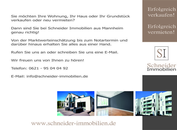 Mit Ihrer Inanspruchnahme und Anfrage bei uns gehen Sie mit uns einen Maklervertrag ein, welcher bei wirksam werdendem Kaufvertrag die Courtage auslöst. Als Rechtsgrundlage gilt allein der geschlossene Kaufvertrag. Im Übrigen gelten die AGB´s der Schneider Immobilien, Heiko Schneider.