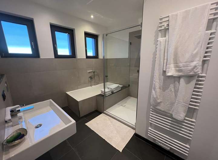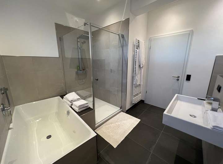 -Badezimmer: Tageslichtbad mit begehbarer Dusche, Badewanne und moderner Regendusche