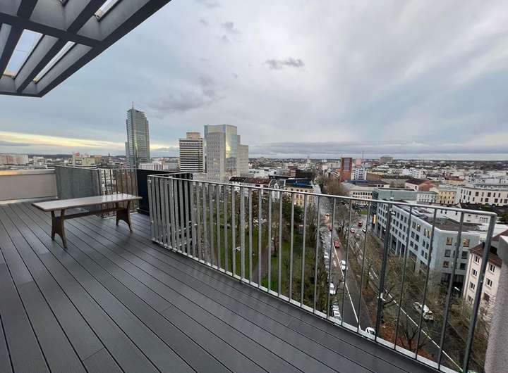 -Terrasse: über die gesamte Gebäuderückseite mit Skylineblick