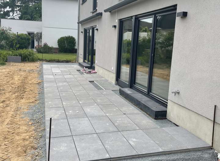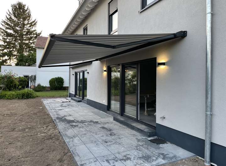 Hochwertige Markise und geflieste Terrasse.