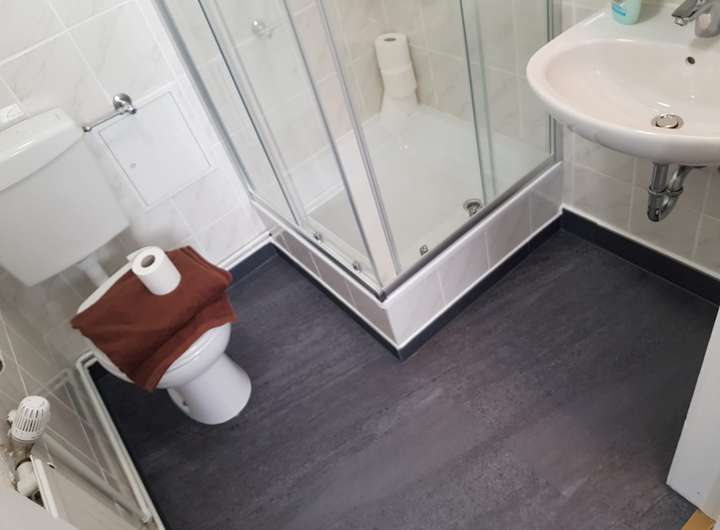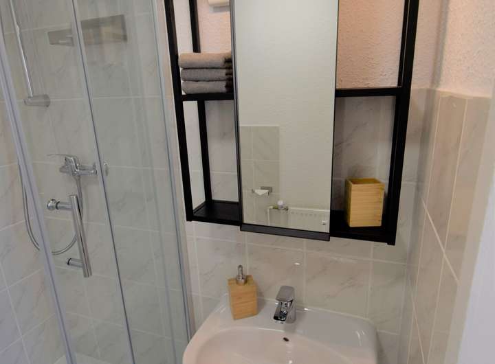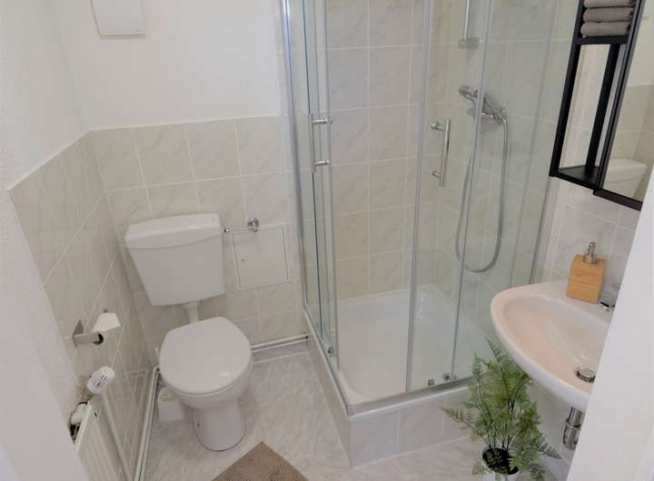 The bathroom of this flat is refurbished in a modern style and invites you to relax.