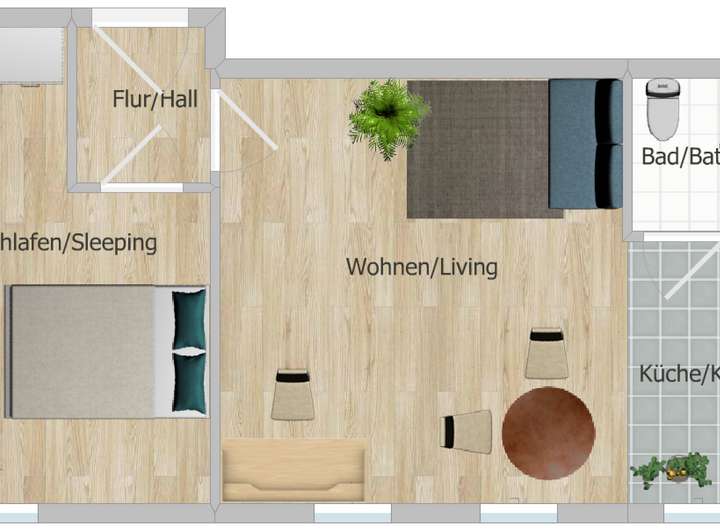 Starting from today, you can rent this flat with a high standard, which is facing south and located on ground floor. The flat has a livingroom with a kitchen, a separate bedroom and a bathroom. It is located within a fully renovated 8-apartment-complex. The recent modernization increases the quality of living and a recent energy pass is available.