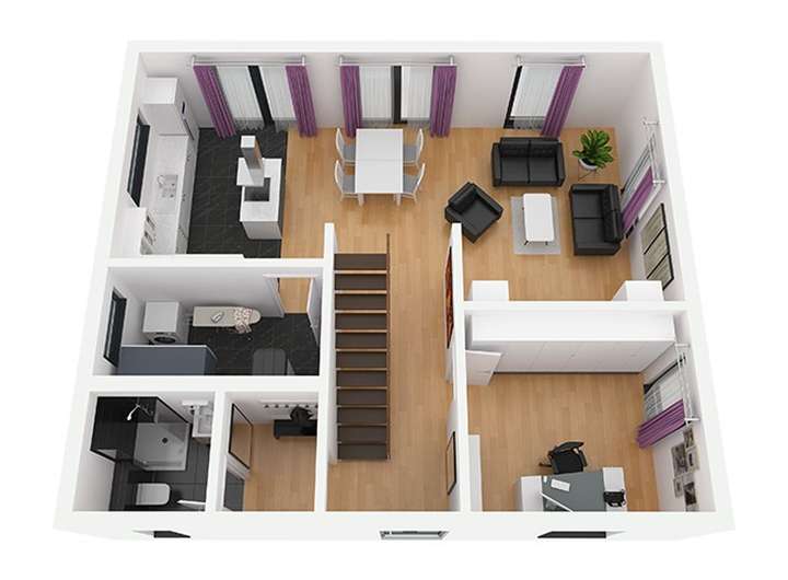 Die Hausarchitektur überzeugt mit Modernität und vielen Details. Die Garage schmiegt sich ans Gebäude an. Hinter der Garage entsteht ein behaglicher, geschützter Terrassenbereich. Die Wohnraumerweiterung im Erdgeschoss setzt sich in einer Terrassenüberdachung fort. Durch die Planung eines Nebeneingangs, kann die Garage auf kürzestem Weg vom Hauswirtschafts-/Haustechnikraum aus betreten werden. Der moderne Hausentwurf bietet auf 170 m² Grundfläche viel Platz für die gesamte Familie. Der Wohn-/Ess- und Kochbereich öffnet sich über 2 große Panorama-Hebeschiebetüren, 2 Terrassentüren und ein bodentiefes Fensterelement zur Terrasse und zum Garten hin. Der Kochbereich kann mit einer Kochinsel ausgestattet werden. Vier Schlafräume, davon einer mit einer separaten Ankleide, und zwei Bäder bringen Wohnkomfort ins Familienleben.
