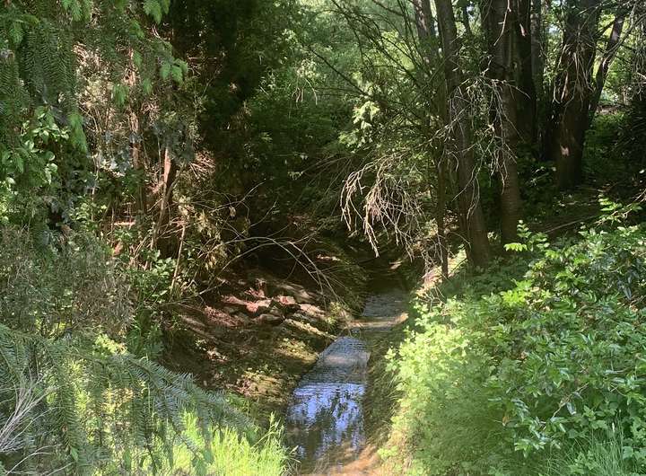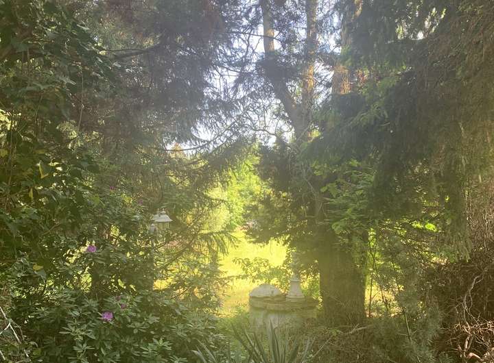 Besonders der Baumbestand und ein kleiner Bach sind charakteristisch für das Grundstück. Der kleine Bach schlängelt sich idyllisch durch das Grundstück im Norden.
