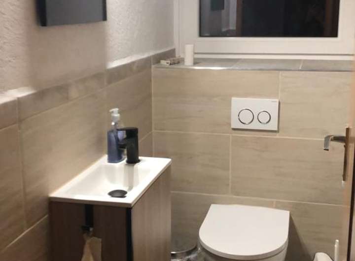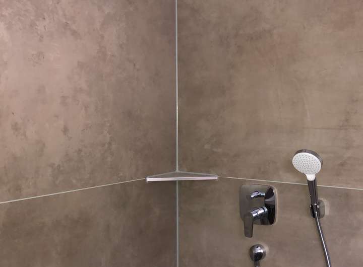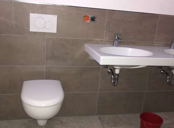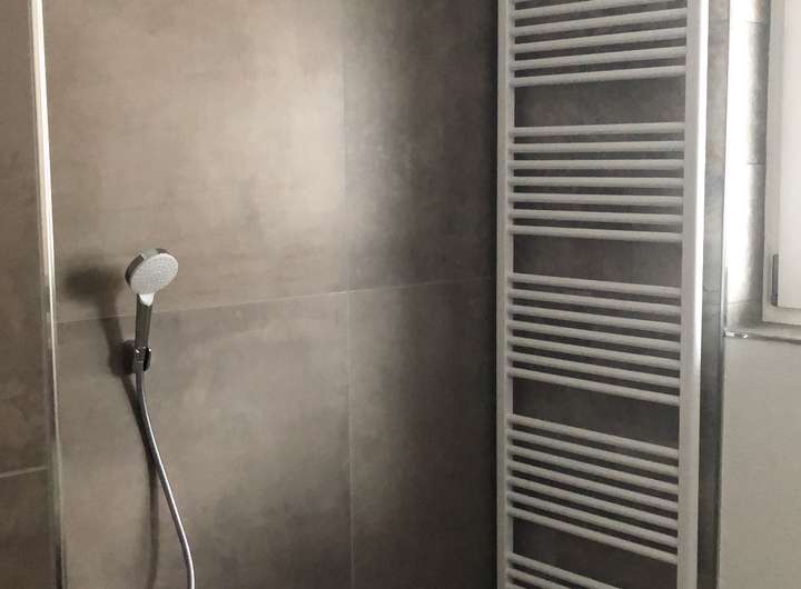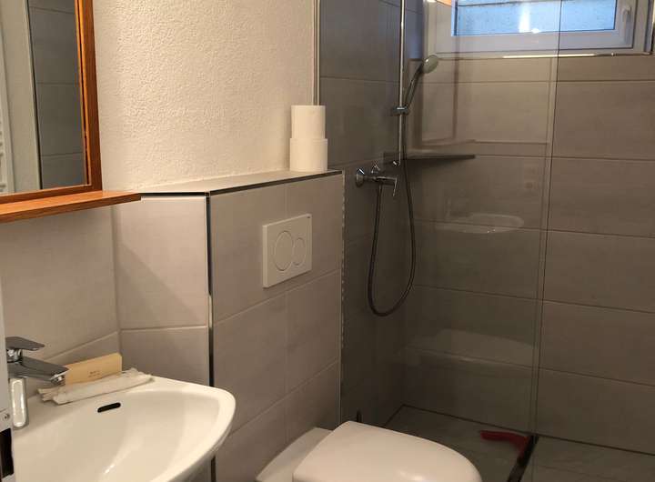 - Badezimmer mit zwei Waschbecken und grosser begehbarer Dusche, sowie einem Waschmaschinenanschluss