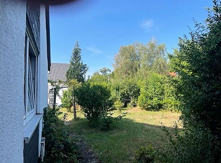 linksseitig des Hauses die Garage mit großzügigem Hofraum (und somit weiterer Kfz.-Abstellmöglichkeit) und überdachtem Zugang zum Haus, ansonsten verbleiben rund um das Haus v.a. in Südost- und Südwestausrichtung großzügige Frei-/Gartenflächen (überwiegend Rasen, teils bepflanzt mit Beeten, Sträuchern und Büschen), das Grundstück ist rundum und von der Straße her uneinsehbar mit Hecken eingefriedet.