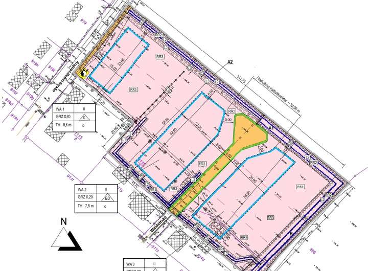 Die Höhe der baulichen Anlagen wurde WA 1 mit 8,50 m, für WA 2 und WA 3 mit 7,50 m (Traufhöhe) als Höchstmaß festgesetzt.