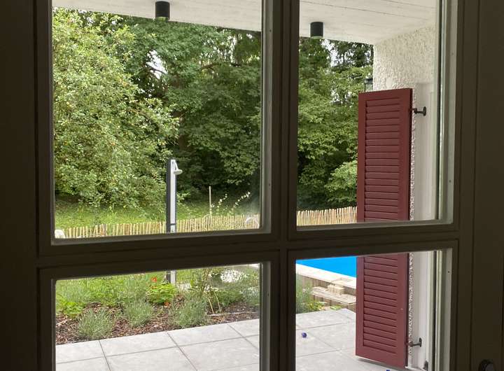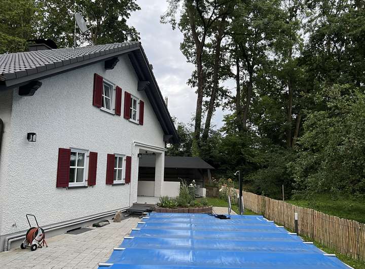 - Schwimmbad im Garten mit Duschmöglichkeit, Terrasse, Hütte für Schwimmbadtechnik, etc.