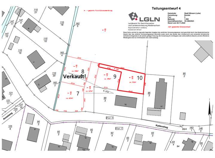 Das Grundstück Nr. 10 (siehe Lageplan) bietet mit 512 m² ausreichend Platz für die Errichtung eines Doppelhauses oder eines Einfamilienhauses.