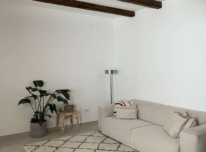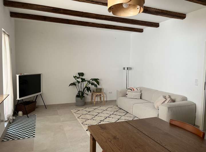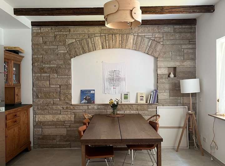 Im Erdgeschoss erwartet Sie ein großes Wohnzimmer mit schönen natürlichen Balken und eine massive Marmorsteinwand.