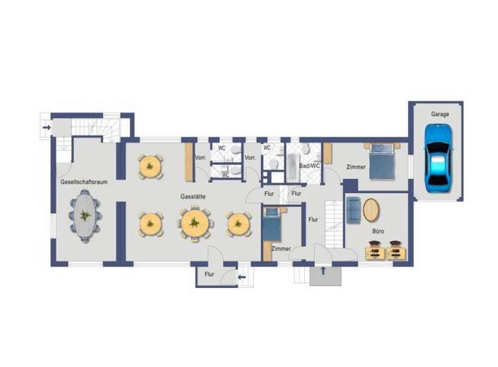 Im Erdgeschoss befindet sich die ca. 110 m² große Gastronomie mit direkten Zugang zum gemütlichen Biergarten, der Küche, dem Gäste-WC sowie dem Büro.