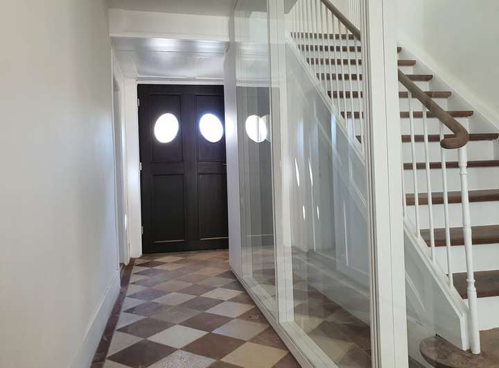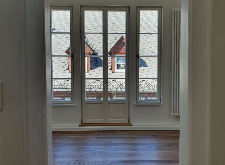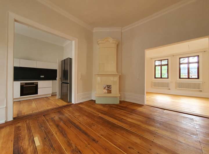 Aufwendig aufgearbeiteter historischer Deckenstuck, neue Böden aus Eichenparkett, restaurierte Holzfenster und Holzinnentüren aus altem Bestand vereint mit neuen Holz-Isofenstern, Fußbodenheizung im Erdgeschoss.