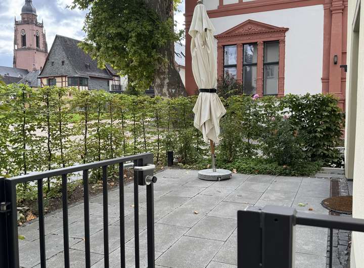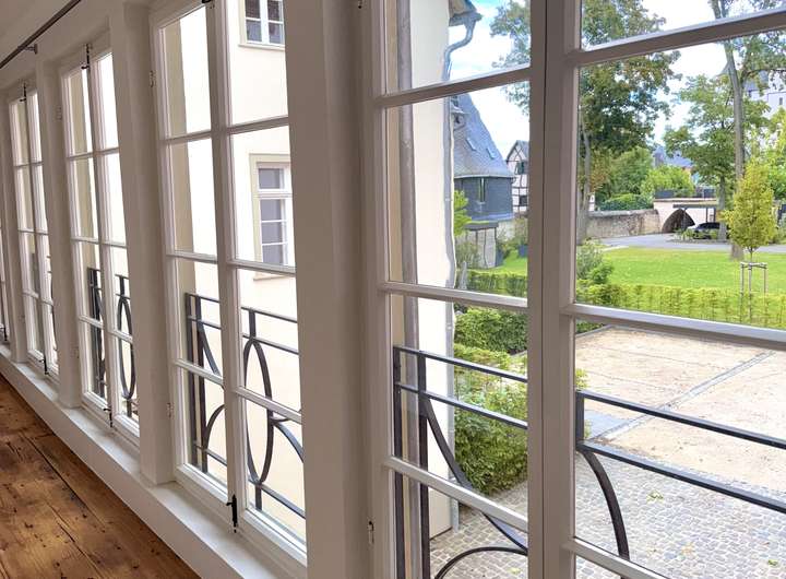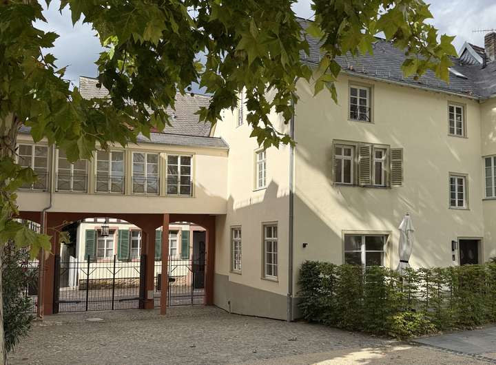 Es ist zentral in der Eltviller Altstadt gelegen und bietet durch seine Nähe zur Uferpromenade einen beeindruckenden Rheinblick sowie eine tolle Aussicht in den an seinen historischen Zustand angelehnten neu geplanten Park des Langwerther Hofes.