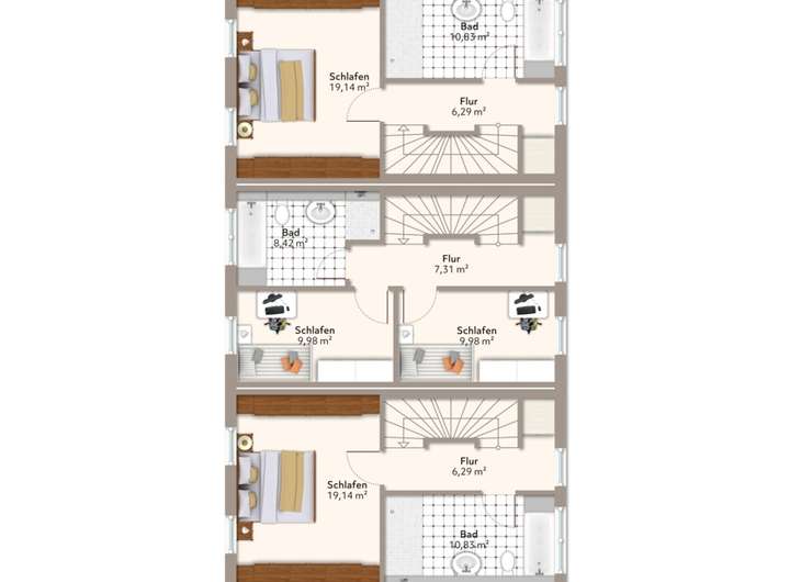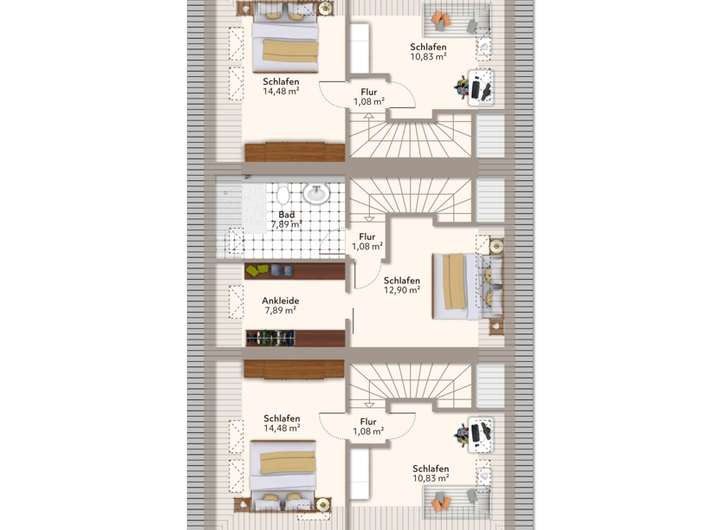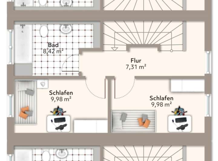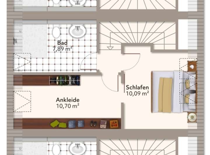 Über die Treppe gelangen Sie ins Obergeschoss bzw. Dachgeschoss. Die Einteilung der Zimmer und Anzahl und Ausstattung der Bäder wird nach Ihren Wünschen geplant.