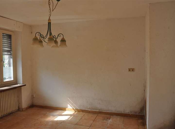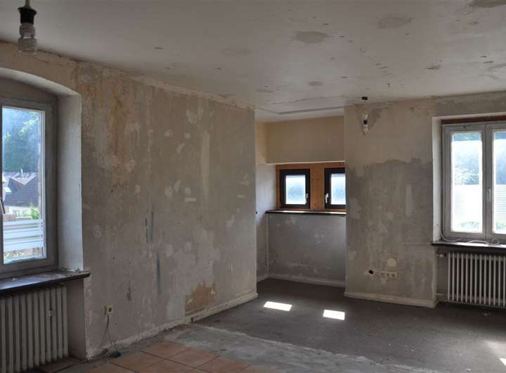 Das Erdgeschoss verfügt über einen Wohnraum, ein separates Esszimmer mit benachbarter Küche (hier könnte eine geräumige ca. 23 m² große Wohnküche entstehen) sowie über ein Gäste-WC im Eingangsbereich.