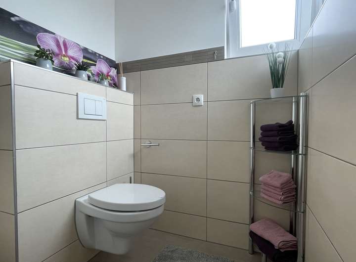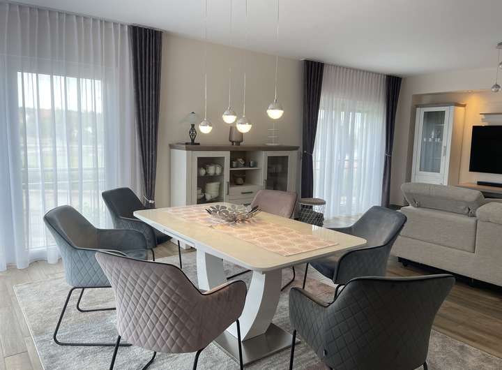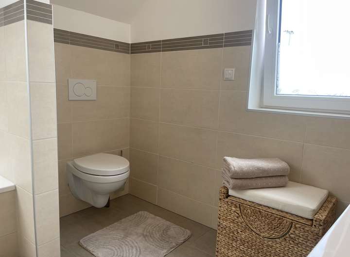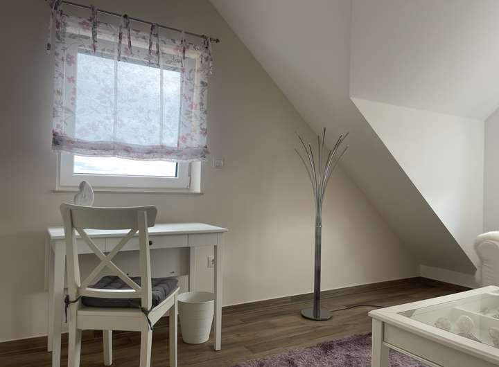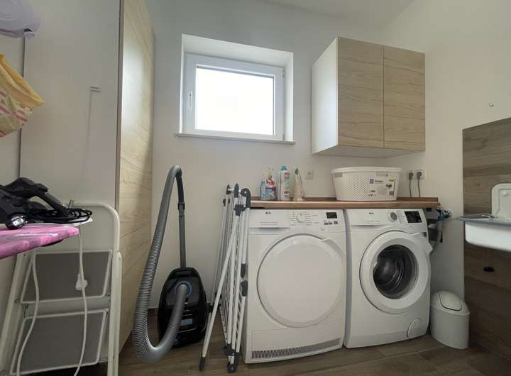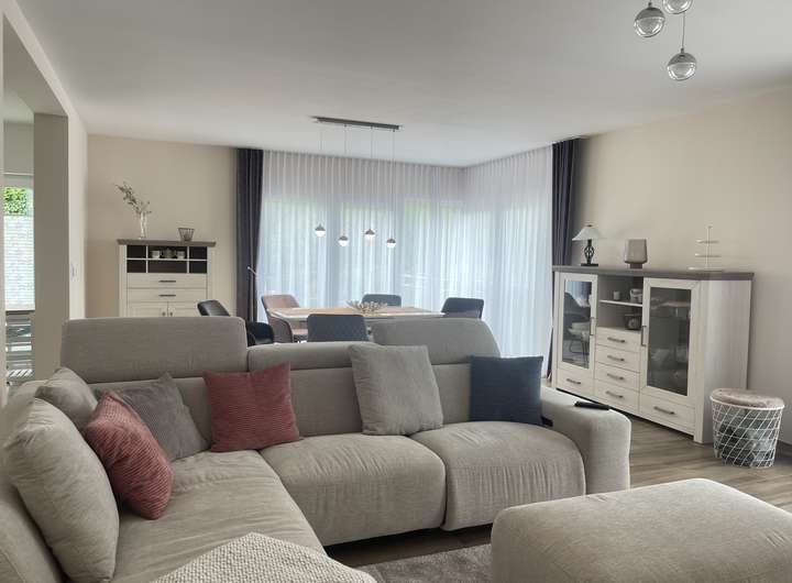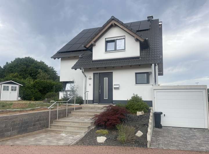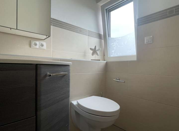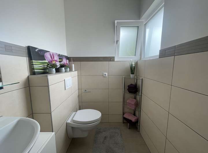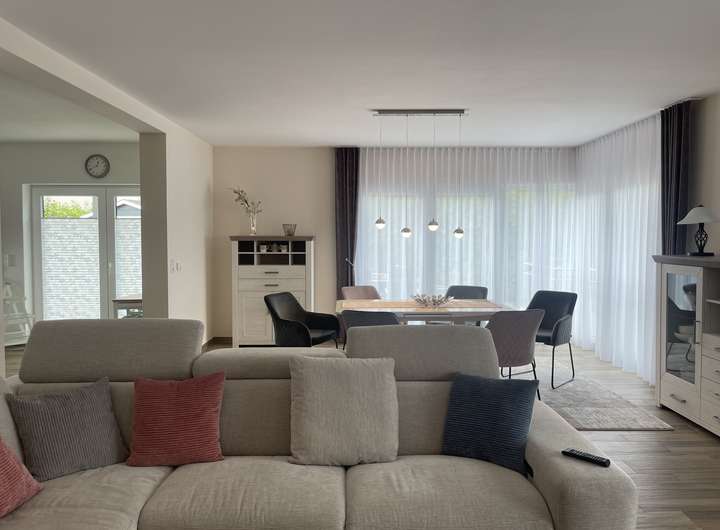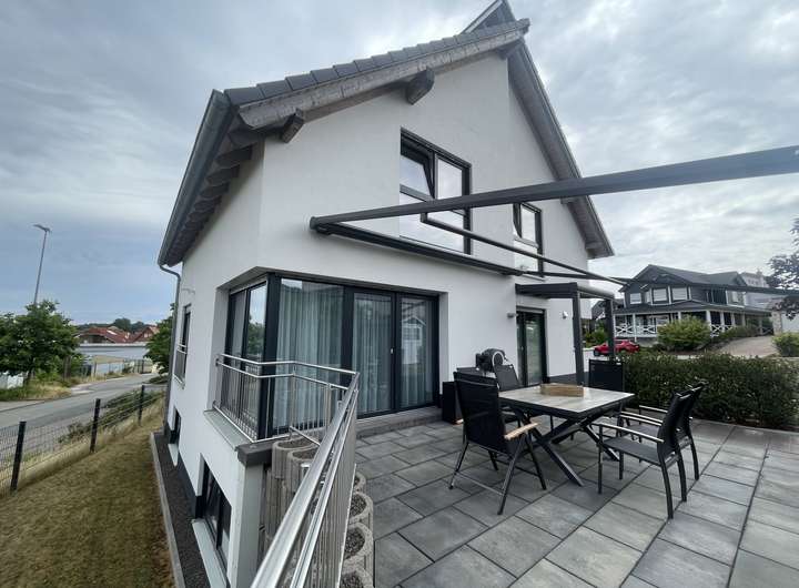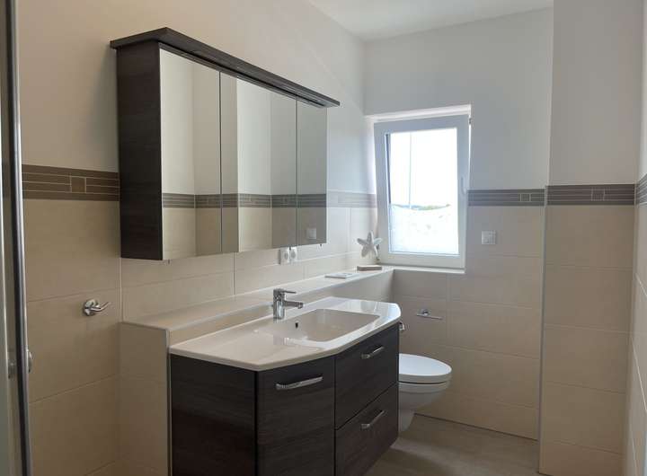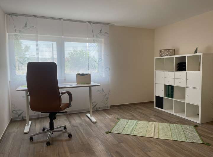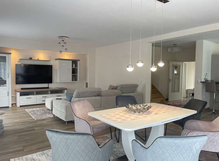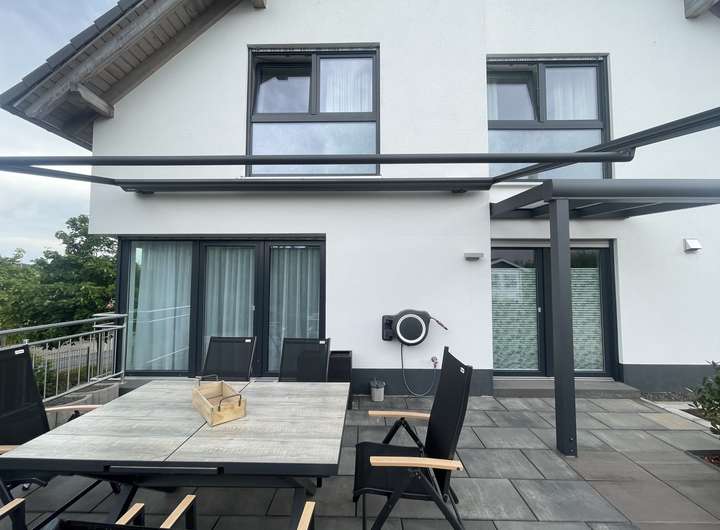 New completely furnished freestanding low-energy house with app. 220 sq.m. living space on 3 levels. First floor (house entry) with living/dining area, kitchen, guest toilet and laundry. Second floor with 3 bedrooms (with air conditioning) and 2 bathrooms. Lower garden level with a bedroom and an office room.