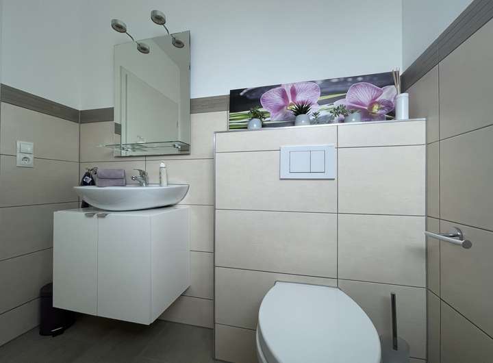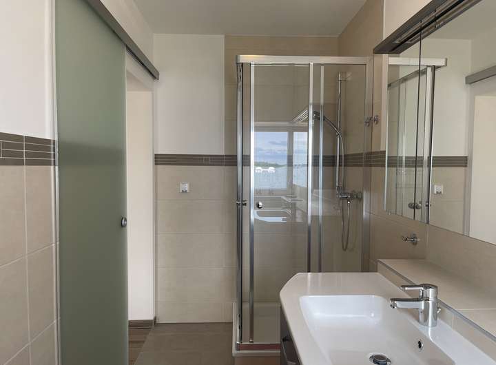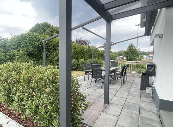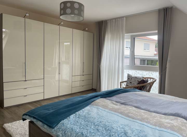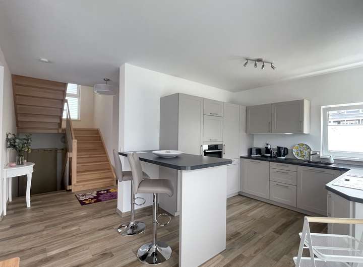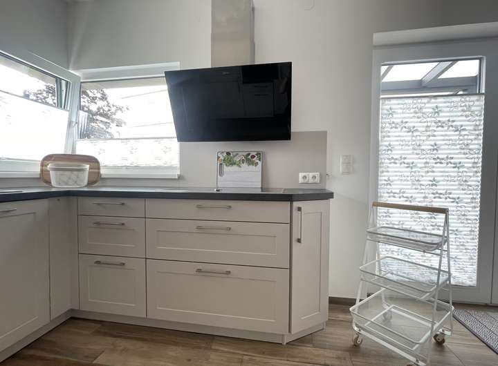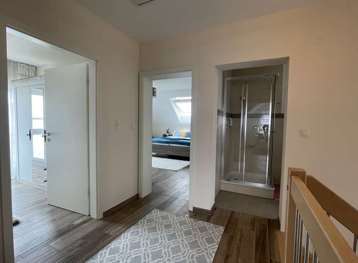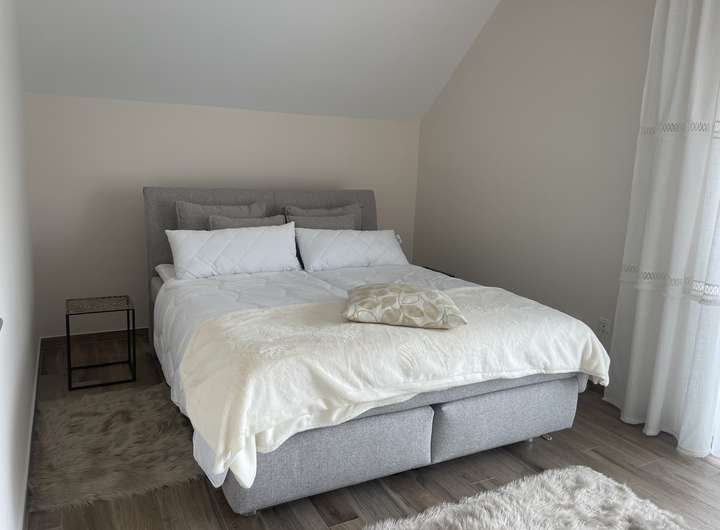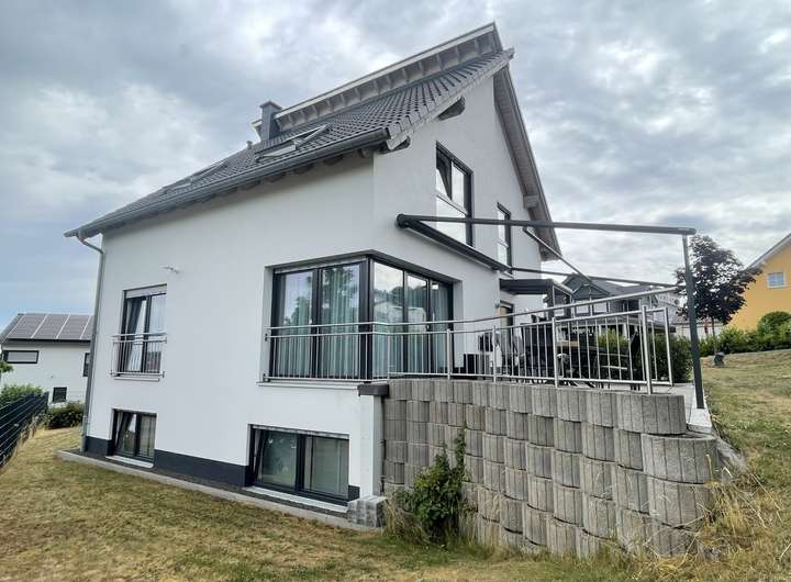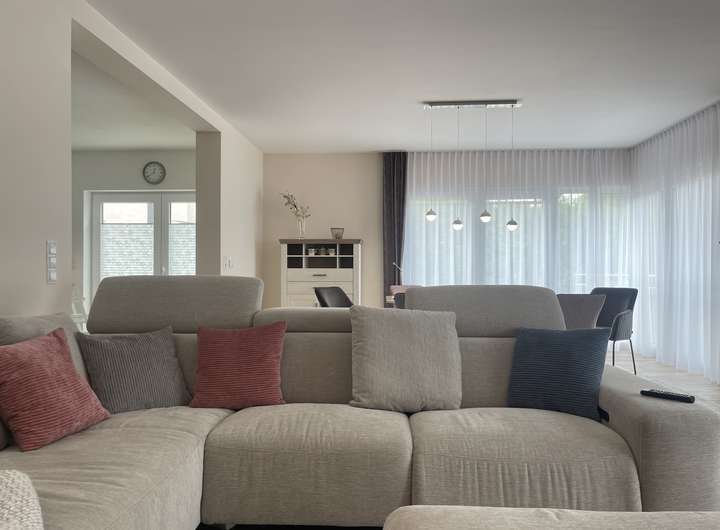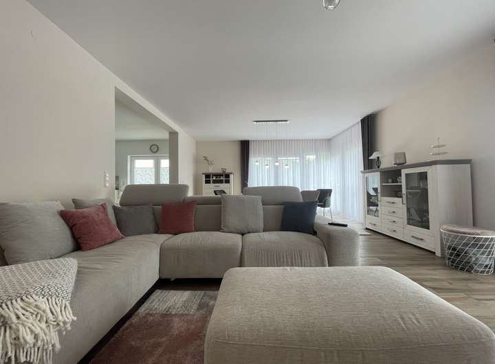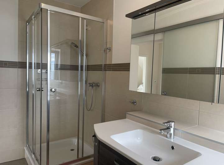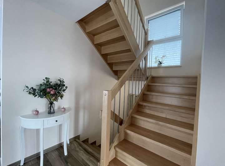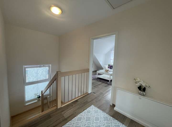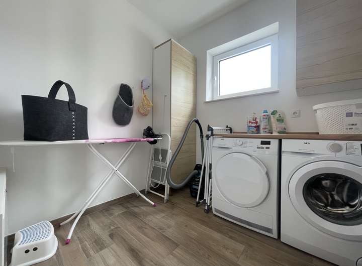 New completely furnished freestanding low-energy house with app. 220 sq.m. living space on 3 levels. First floor (house entry) with living/dining area, kitchen, guest toilet and laundry. Second floor with 3 bedrooms (with air conditioning) and 2 bathrooms. Lower garden level with a bedroom and an office room.