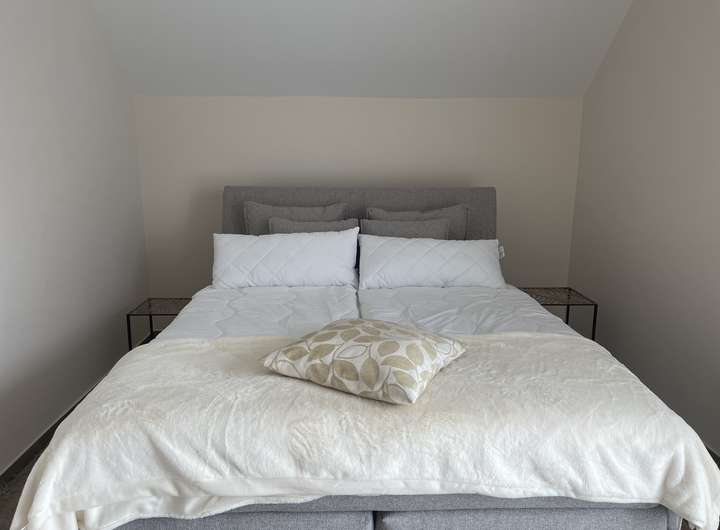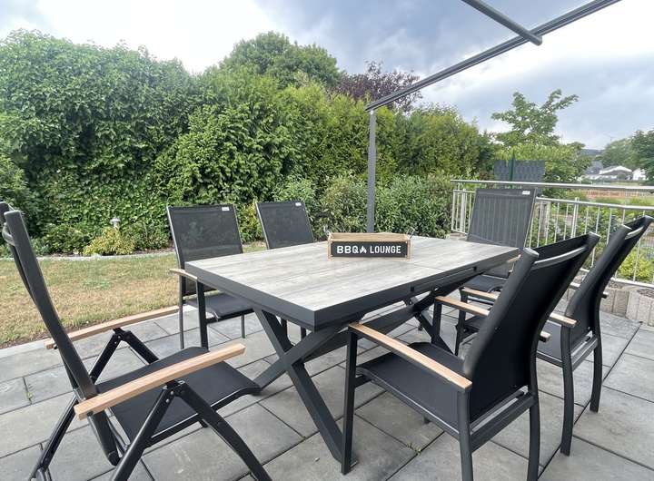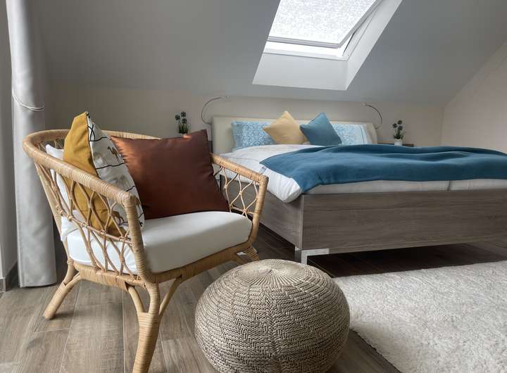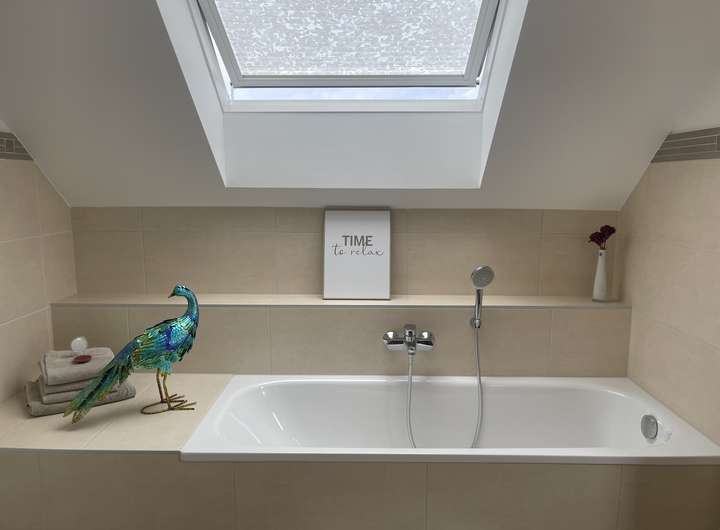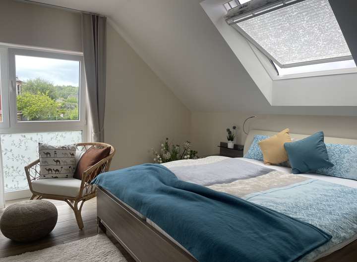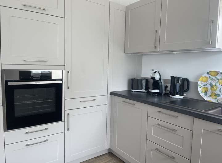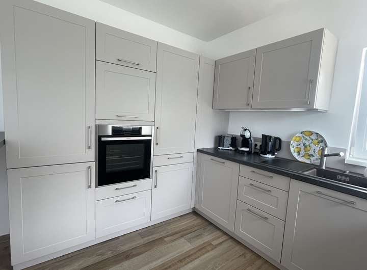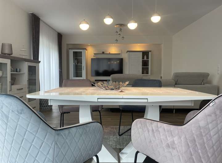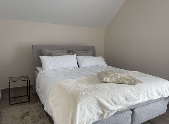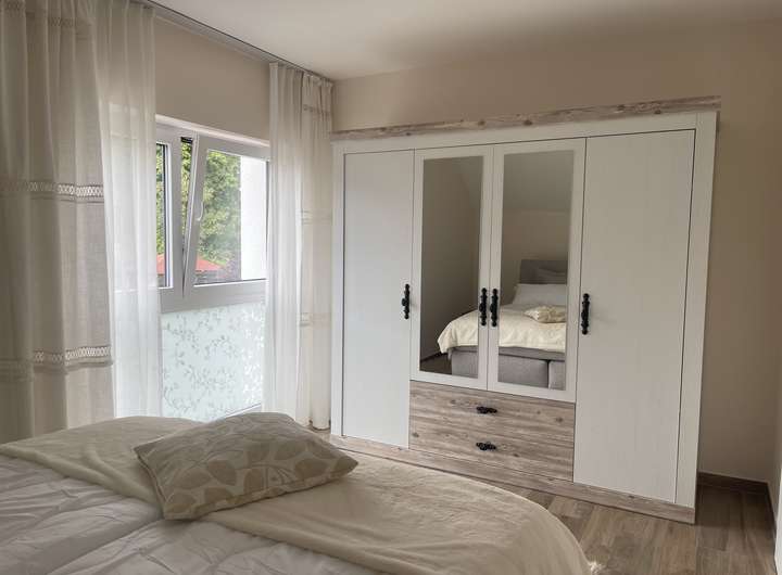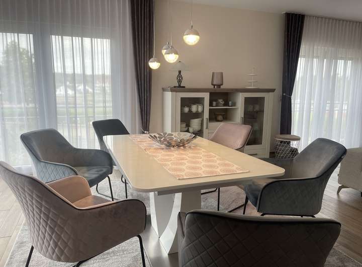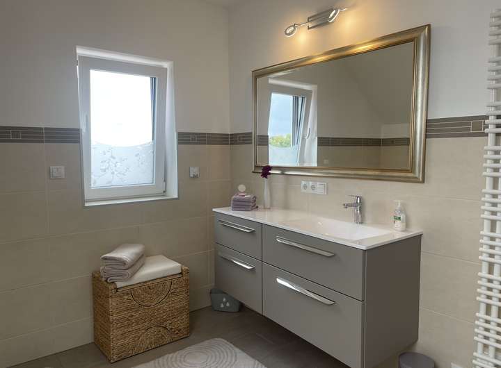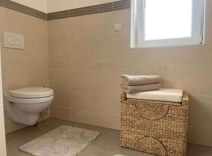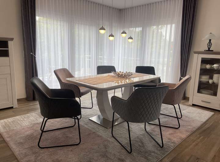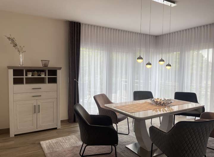 New completely furnished freestanding low-energy house with app. 220 sq.m. living space on 3 levels. First floor (house entry) with living/dining area, kitchen, guest toilet and laundry. Second floor with 3 bedrooms (with air conditioning) and 2 bathrooms. Lower garden level with a bedroom and an office room.