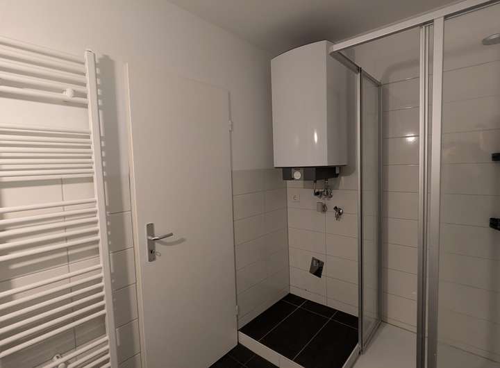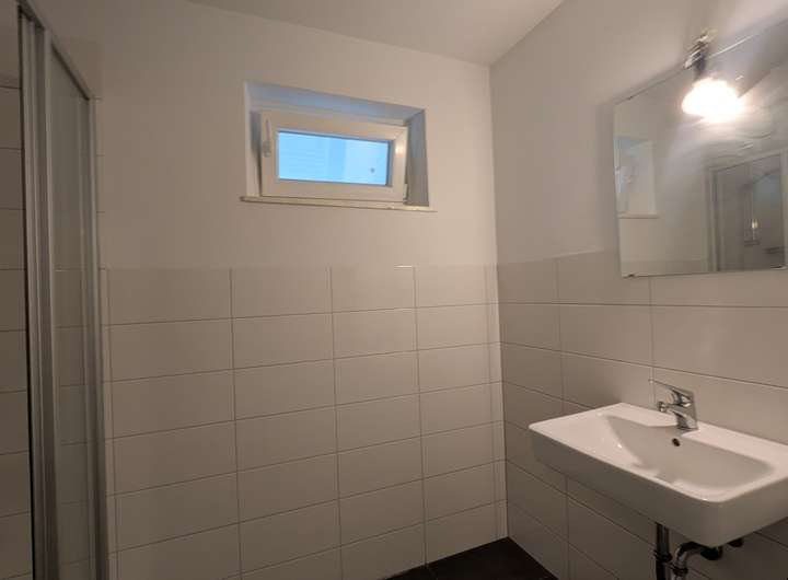 Das Tageslichtbad ist mit Dusche, Waschbecken, Heizkörper, einem Boiler für Warmwasseraufbereitung und Waschmaschinenanschluss ausgestattet. Das WC mit einem weiteren Waschbecken ist in einem separaten Raum vorhanden.