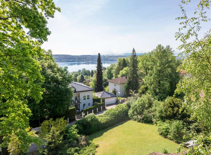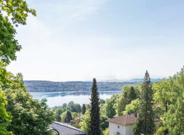 Ein charmanter Garten mit viel Grün, Wiese und altem Baumbestand und die ruhige und private Lage machen die Attraktivität des Grundstücks aus. Im Obergeschoss entfaltet sich ein schöner Seeblick auf den Starnberger See, aber auch von der Terrasse und dem Garten aus gibt es reizvolle Ausblicke auf die umgebende Landschaft.