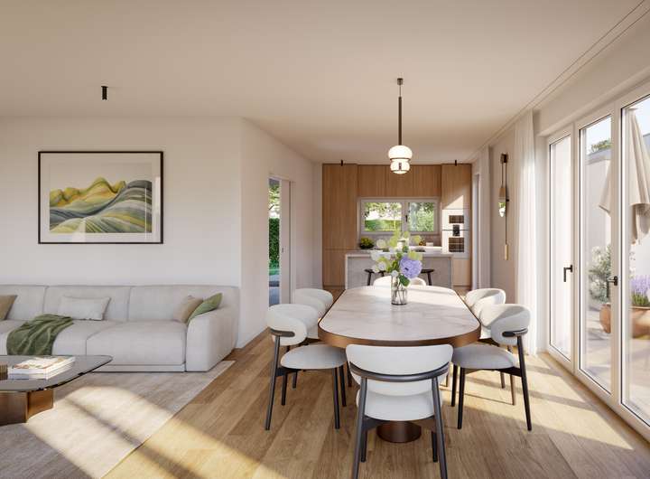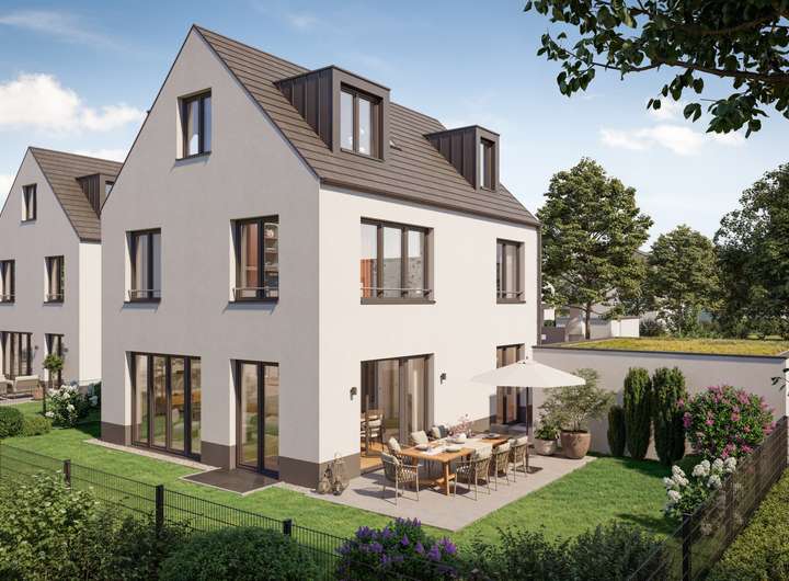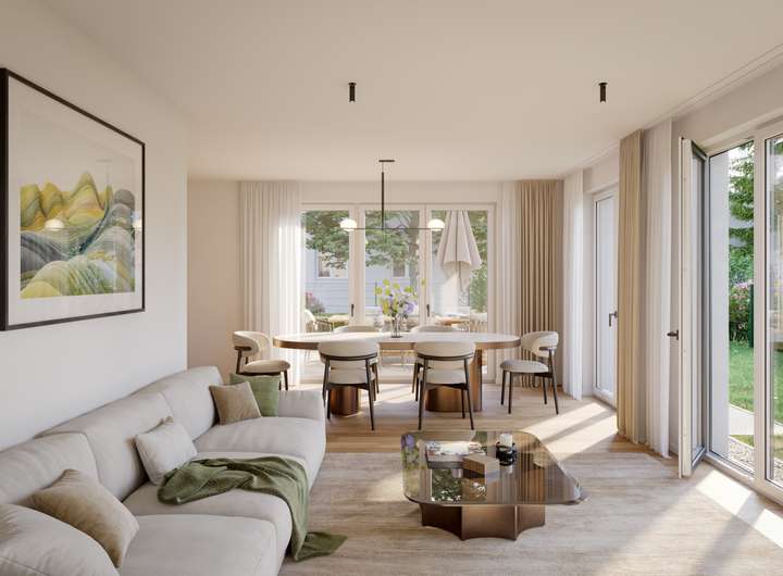 Großzügige, bodentiefe Fenster sorgen für helle und angenehm lichtdurchflutete Räume und ermöglichen einen freien Blick in die begrünten Nachbarschaftsgärten. Die moderne Planung legt besonderen Wert auf Offenheit und Funktionalität: Weite Wohnbereiche und offen gestaltete Küchen schaffen ein zeitgemäßes Wohnambiente mit klaren Strukturen und hoher Qualität.