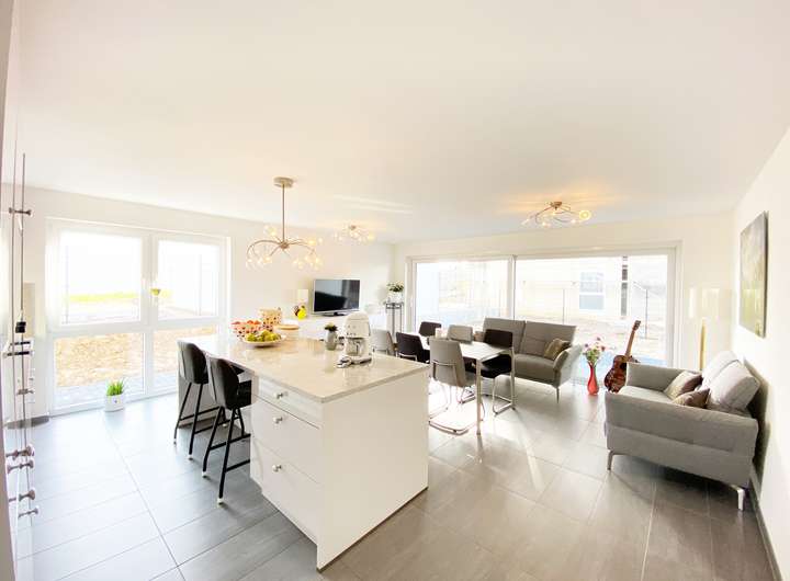 Große Glasfronten lassen die Räume sehr hell und freundlich wirken. Dies entspricht dem Gedanken eines zeitgemäßen und mordernen Wohngefühls. Der Austritt und das Verweilen auf Ihrem Balkon oder Ihrer Terrasse mit Garten erhöht die Lebensqualität und das Wohlbefinden aller Bewohner.