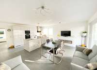 Moderne Fliesen kombiniert mit weissen Wänden schaffen Komfort und ein besonderes Wohnerlebnis. Eine Fussbodenheizung ist in allen Wohnräumen vorgesehen.