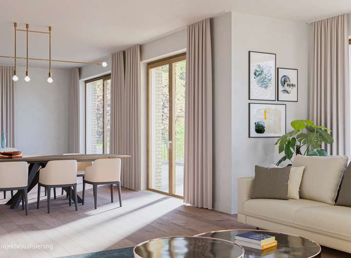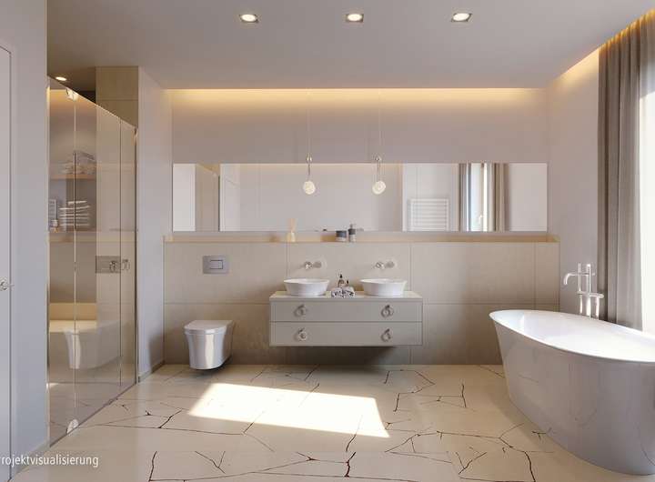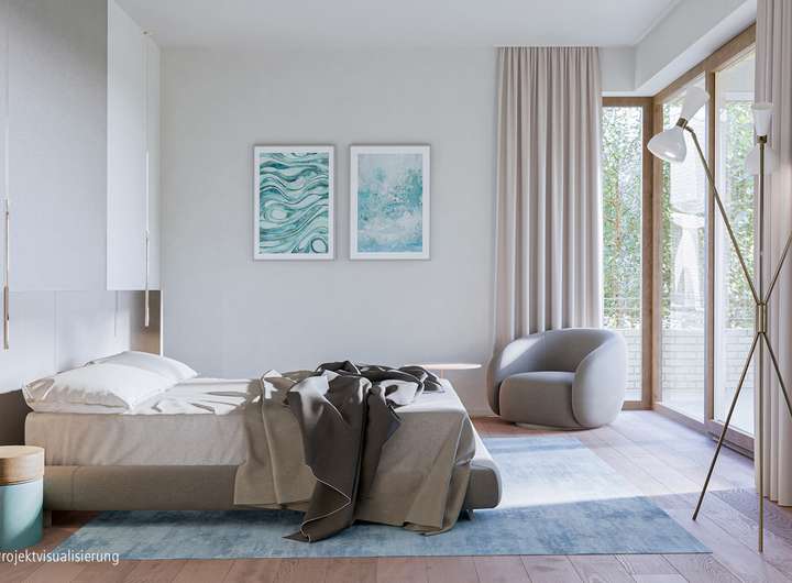 Im Interieur setzt sich die reduzierte und qualitativ hochwertige Gestaltung fort: mit Raumhöhen von ca. 2,80 Meter, mit Mastersuiten in allen Wohnungen und Tageslichtbädern.