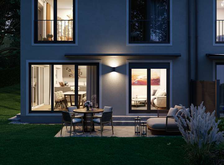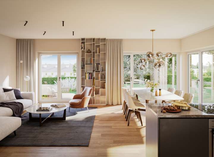 Die Häuser sind in eine ruhige Nachbarschaft eingebettet und wurden mit großer Sorgfalt geplant. Bodentiefe Fenster fluten die Wohnräume mit Licht und bieten ungestörte Ausblicke auf die liebevoll gestalteten Gärten – Privatsphäre inklusive.