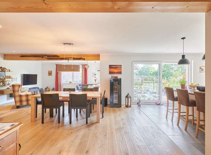 Dieses moderne Einfamilienhaus aus dem Jahr 2015 in Holzständerbauweise überzeugt durch energieeffiziente Ausstattung und ein durchdachtes Raumkonzept. Auf ca. 164 m² Wohnfläche verteilen sich fünf Zimmer, zwei Bäder sowie ein großzügiger Wohn- und Essbereich mit massiven Eichenbohlen, sichtbaren Deckenbalken und direktem Zugang zur sonnigen Süd-West-Terrasse. Eine Erdwärmepumpe, Fußbodenheizung, dreifach verglaste Fenster und eine Photovoltaik-Anlage sorgen für niedrige Energie¬kosten; überschüssiger Strom wird aktuell ins Netz eingespeist.
