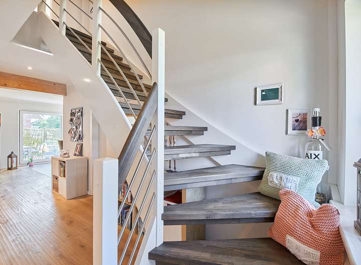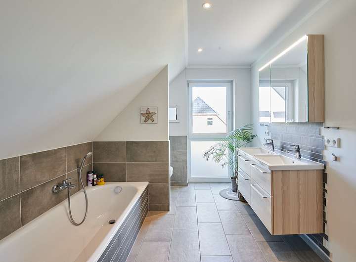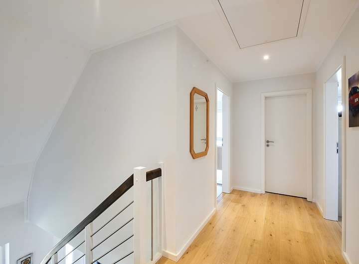 Im Erdgeschoss befinden sich neben dem großen Wohnbereich ein Schlafzimmer mit Duschbad en Suite, ein Gäste-WC und ein geräumiger Hauswirtschaftsraum mit direktem Zugang zum Doppelcarport. Im Dachgeschoss stehen drei weitere Zimmer, ein Vollbad und ein Abstellraum zur Verfügung. Der über 11 m lange Spitzboden bietet zusätzliches Ausbaupotenzial. Eine Nutzung als Zweifamilienhaus bzw. der Betrieb einer Ferienwohnung ist gemäß Bebauungsplan möglich.