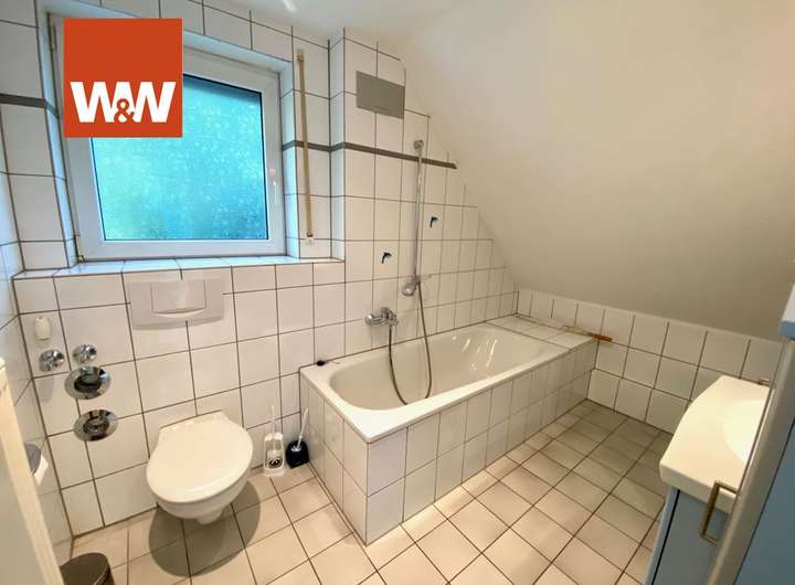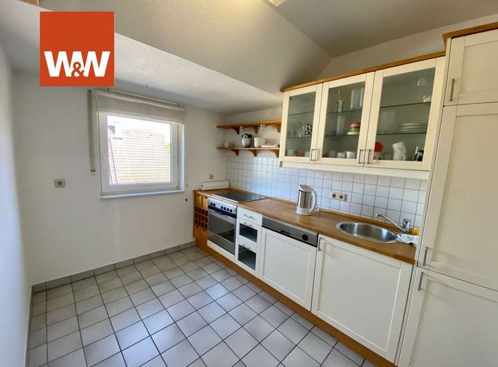Ihnen stehen hier zur Verfügung: Wohnzimmer mit sonnigem Süd-Balkon, gemütliches Schlafzimmer mit Einbauschrank im Spitzboden, Küche, Diele und ein Tageslichtbad mit Badewanne.