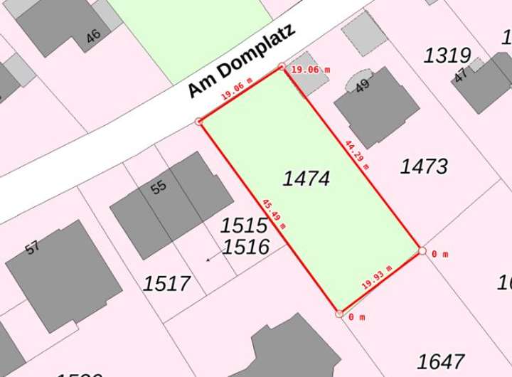 Das Grundstück erstreckt sich über eine Fläche von 895m² und zeichnet sich durch seinen nahezu rechteckigen Zuschnitt aus, mit einer Breite von maximal rund 20 m und einer Tiefe von maximal etwa 45 m.
