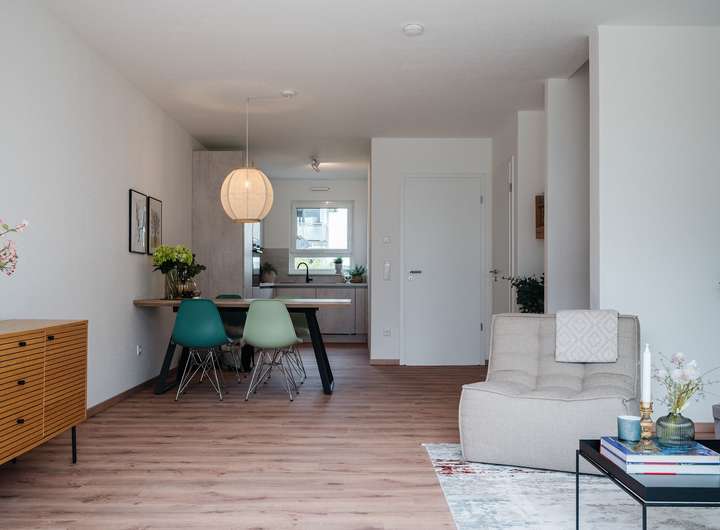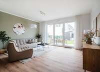 - **Lichtdurchflutete Räume:** Genießen Sie ein helles und freundliches Wohngefühl in allen Zimmern, dank großzügiger Fensterflächen, die viel Tageslicht hereinlassen und für eine angenehme Atmosphäre sorgen. - **Energieeffiziente 3-fach-Verglasung:** Die hochwertigen Fenster mit 3-fach-Verglasung bieten exzellenten Schall- und Wärmeschutz. So bleibt es im Winter warm und im Sommer angenehm kühl – für ein perfektes Raumklima und einen geringen Energieverbrauch. - **Kontrollierte, feuchtigkeitsgesteuerte Wohnraumentlüftung:** Ein modernes Lüftungssystem sorgt automatisch für frische Luft im gesamten Wohnraum und reguliert die Luftfeuchtigkeit, um ein gesundes Raumklima zu gewährleisten und Feuchtigkeitsschäden zu vermeiden. - **Moderne Wand- und Bodenfliesen von Markenherstellern:** Setzen Sie Akzente mit hochwertigen Wand- und Bodenfliesen von renommierten Herstellern. Diese stilvollen Fliesen bringen nicht nur Eleganz in Ihre Räume, sondern sind auch langlebig und pflegeleicht. - **Moderne Tageslichtbäder:** Die hellen, lichtdurchfluteten Bäder bieten nicht nur ein luxuriöses Ambiente, sondern sorgen durch großzügige Fenster für ein offenes und erfrischendes Raumgefühl – der perfekte Rückzugsort für entspannte Momente. - **Attraktive Badausstattung zur individuellen Auswahl:** Wählen Sie Ihre persönliche Badausstattung aus einem attraktiven Sortiment führender Marken wie Villeroy & Boch oder Kaldewei. Hochwertige Materialien und zeitloses Design machen Ihr Badezimmer zu einem stilvollen Wohlfühlort. - **Erstklassige Armaturen zur Auswahl:** Setzen Sie in Ihrem Bad und Ihrer Küche auf erstklassige Armaturen, z. B. von Grohe. Diese Markenarmaturen stehen für höchste Qualität, modernes Design und langlebige Funktionalität. - **Modernes Schalterprogramm von Gira:** Stilvolle Schalter und Steckdosen aus dem modernen Gira-Programm fügen sich harmonisch in die Gestaltung Ihrer Wohnräume ein und bieten gleichzeitig höchste Funktionalität und Qualität. - **Wärmepumpe mit Fußbodenheizung im gesamten Haus:** Genießen Sie den Komfort einer Fußbodenheizung im gesamten Haus. Die Kombination aus effizienter Wärmepumpe und Fußbodenheizung sorgt für wohlige Wärme und ein angenehmes Raumklima – ohne störende Heizkörper. - **Elektrische Rollläden im Erd- und Obergeschoss:** Komfortable elektrische Rollläden in allen Etagen bieten Ihnen optimalen Sonnenschutz und Privatsphäre. Diese lassen sich bequem per Knopfdruck bedienen und fügen sich nahtlos in die moderne Ausstattung Ihrer Wohnräume ein. - **Vorbereitete Wand- und Deckenflächen:** Die Wände und Decken sind für Ihre individuelle Gestaltung vorbereitet. So haben Sie die Möglichkeit, Ihre persönlichen Farbideen zu verwirklichen und den Räumen einen individuellen Charakter zu verleihen.