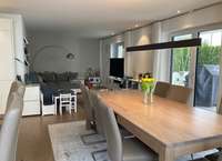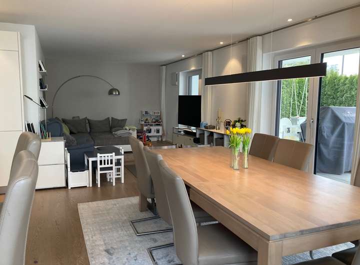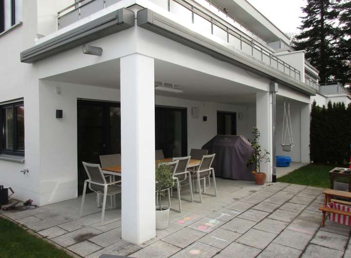 Es handelt sich um eine Erdgeschoss- und 1. Obergeschosswohnung mit 220 qm Wohnfläche und großer überdachter Terrasse. Außerdem hat die Wohnung einen kleinen eigenen Garten, eine Doppelgarage und einen absperrbaren Abstellraum im Keller.