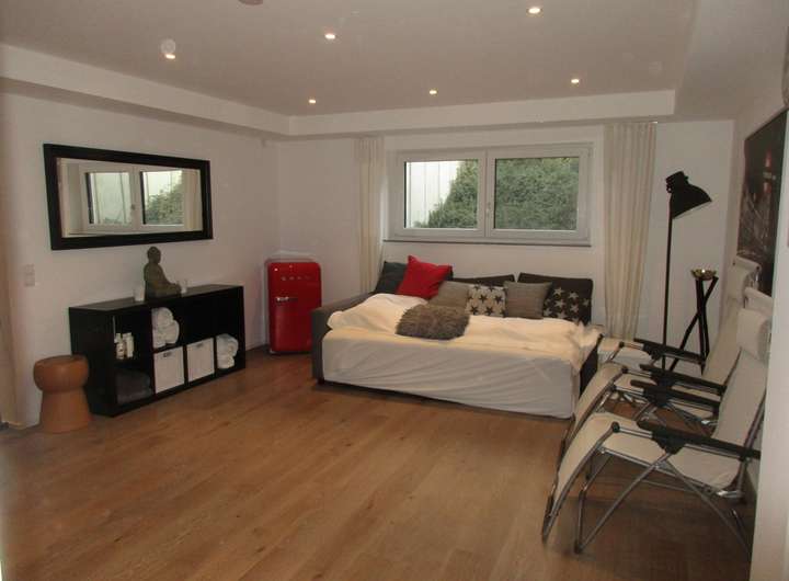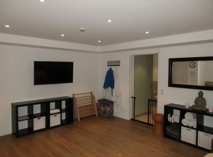 Außerdem sind die drei Bäder bereits mit Spiegeln und Badmöbeln ausgestattet. Die hochwertige Mieleküche (Dampfgarer/Mikrowelle, Backofen, Induktionsherdfeld, Kühlschrank, Spülmaschine) hat eine Garantieverlängerung der Elektrogeräte bis 2027 und ist im Mietpreise inkludiert. Im UG befindet sich eine Klafs-Sauna.