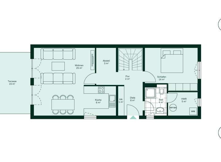 Willkommen in Ihrem neuen Zuhause. Im Erdgeschoss erwartet Sie ein großzügiges Wohnzimmer, perfekt für gemütliche Abende miteinander. Die integrierte offene Küche lädt zum gemeinsamen Kochen ein. Die Terrasse ist ideal für entspannte Stunden im Freien geeignet. Ein Schlafzimmer bietet Ihnen den nötigen Komfort und Privatsphäre. Das Badezimmer und ein Hauswirtschaftsraum runden das Erdgeschoss ab.
