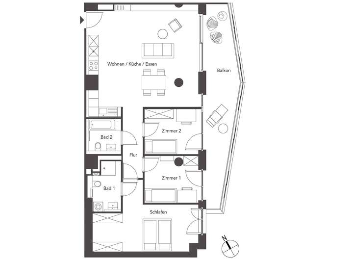 Die hohen Innenräume werden zu modernen Lofts mit offenen Wohnbereichen ausgebaut. Somit bleibt die Grundstruktur des Gebäudes mit seinen runden Betonstützen und Decken mit offenen Unterzügen erhalten – dies gibt den Räumen durch ihre Weite eine besondere Wirkung. Großzügige Fensterfronten lassen das Tageslicht in die Räume strömen und schaffen ein Zuhause mit Offenheit, Helligkeit und einer wertigen Innenausstattung. Die geschwungenen Balkone erweitern den Wohnbereich nach außen und können größtenteils mit einer Schiebeverglasung zu ca. zwei Dritteln windgeschützt geschlossen werden.
