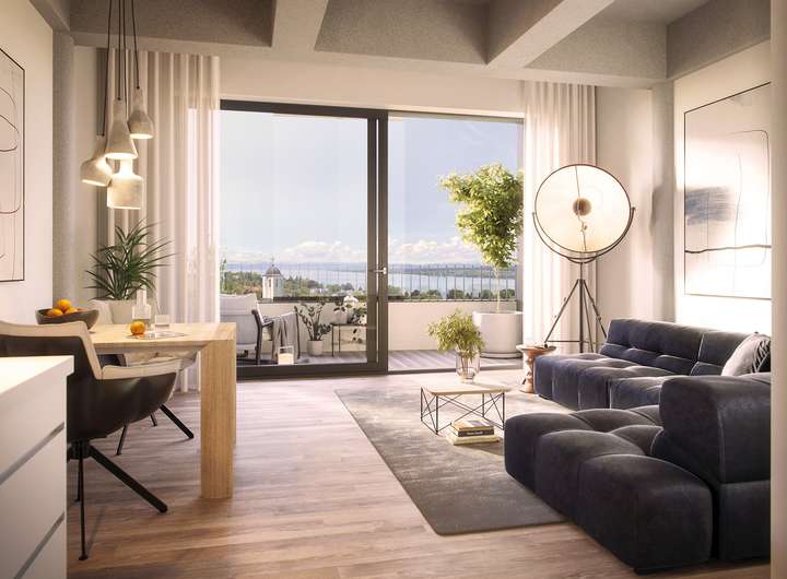 Eine Dachterrasse im 16. Obergeschoss ist für alle Bewohnerinnen und Bewohner des Hauses zugänglich und bietet einen atemberaubenden Ausblick. Genießen Sie von dort vielfältige Blicke in die Umgebung – den Bodensee, die historische Altstadt, die Insel Reichenau, die Berge und den Hegau.